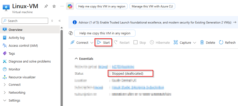 - Navigate back to your VM’s Overview page and hit Start.
