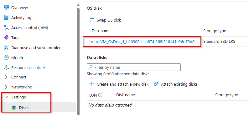 - Go back to your VM’s menu and select Disks, then click on your OS Disk.